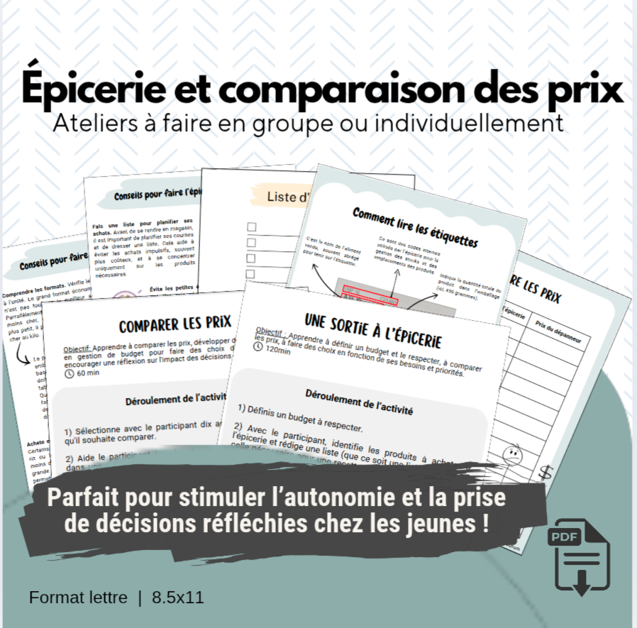 Vous accompagnez des adolescent(e)s vers l’autonomie et souhaitez les aider à faire l'épicerie efficament ? Ces deux ateliers leur offriront des outils concrets pour faire des choix éclairés en matière d’achats alimentaires, éviter les pièges de la consommation et ce , tout en développant leur autonomie.