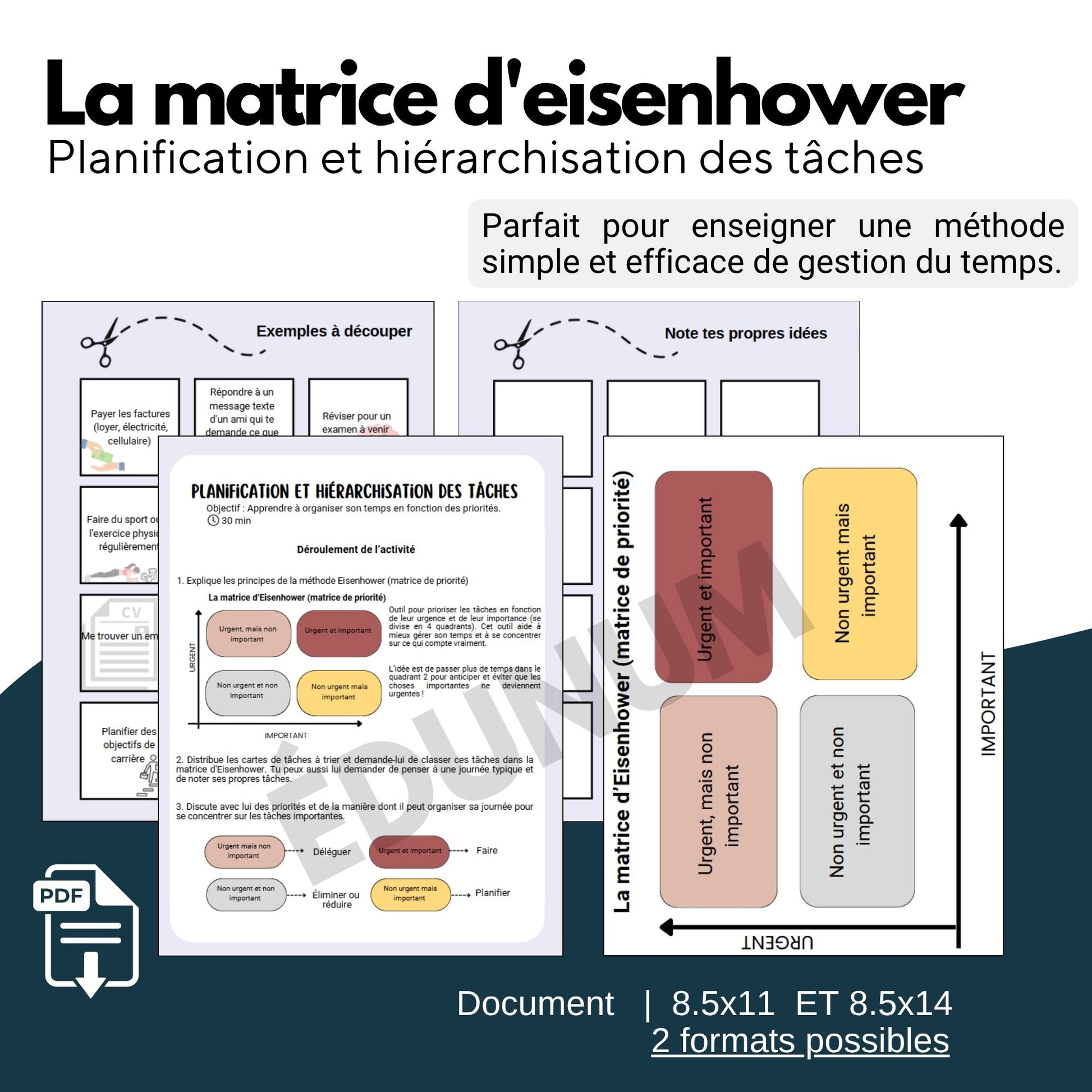 Aidez les jeunes à mieux organiser leur temps grâce à la matrice d’Eisenhower ! Cet atelier pratique leur apprend à distinguer l'urgent de l'important, à classer leurs tâches et à réfléchir à leurs priorités. À travers un exercice de tri et une discussion guidée, ils découvriront comment structurer leur journée pour se concentrer sur ce qui compte vraiment.