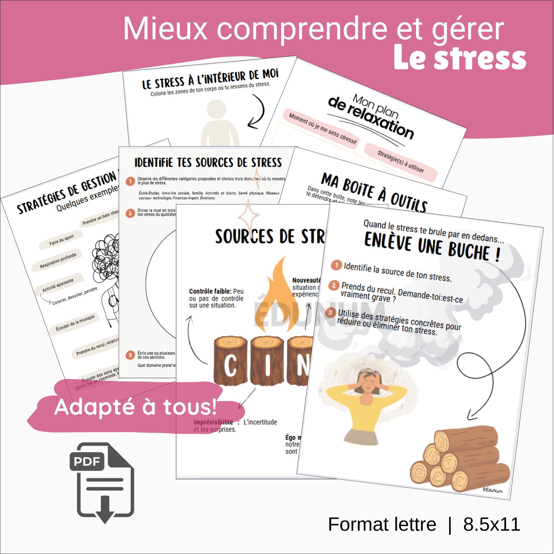 ✅ Affiches explicatives; modèle CINÉ, stratégies de gestion du stress, quoi faire quand le stress t'envahit.