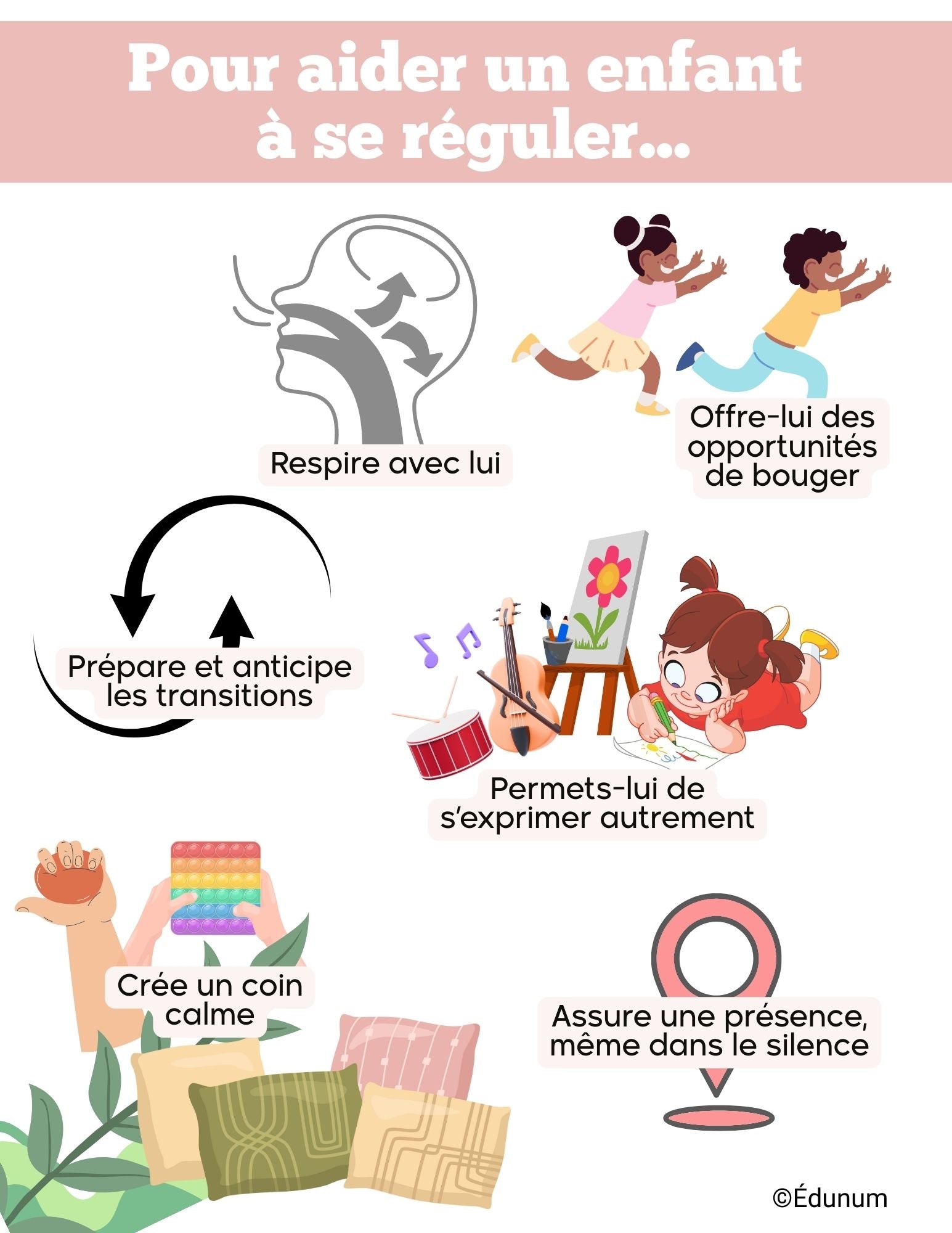 🌿 Pour qu’un enfant apprenne à se réguler, il a d’abord besoin de conditions favorables : un cadre rassurant, un espace pour se ressourcer, des opportunités de bouger, et la possibilité de s’exprimer autrement.